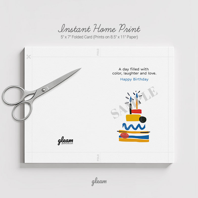 Featuring a vibrant cake illustration and the joyful message “A day filled with color, laughter and love,” this digital card is perfect for art lovers of all ages.