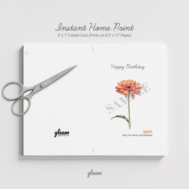 Celebrate the life of the party with this bold ESFP birthday card. Featuring a vibrant orange gerbera daisy and fun-loving words like spontaneous, joyful, and lively – this printable card matches their bright spirit. Print it and get ready to party!