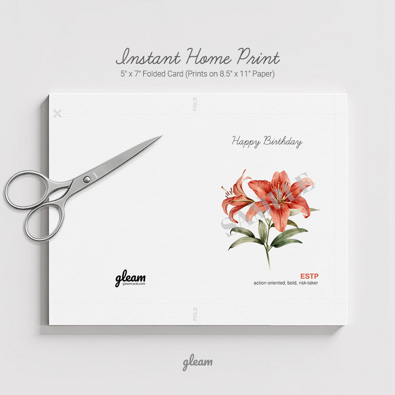 Bring the energy with this bold ESTP birthday card. A striking red lily reflects their fearless and spontaneous spirit – action-taker, lively, adventurous. Download, print, and surprise them with something as bold as they are.