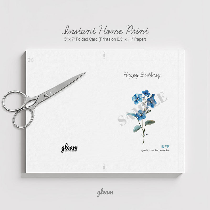 Make an INFP feel seen with this soft and meaningful birthday card. Delicate blue flowers and heartfelt words – gentle, imaginative, sensitive – speak to their deep inner world. Download, print, and send them a card that feels personal.