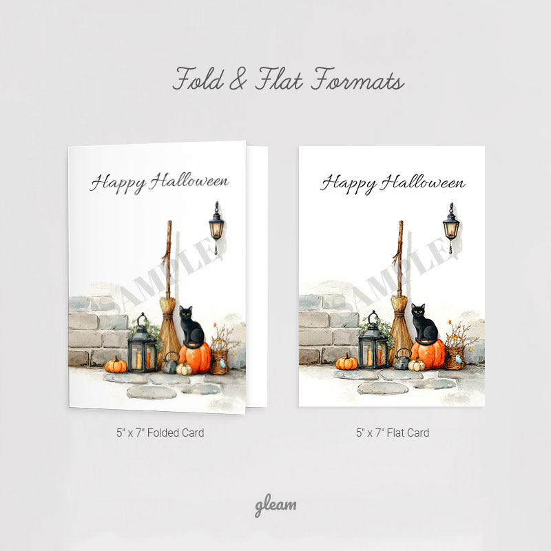 Bring cozy Halloween vibes with this watercolor-style card featuring a black cat, pumpkins, broom, and lantern. A warm and festive printable card perfect for autumn greetings. Instant download and easy to print.